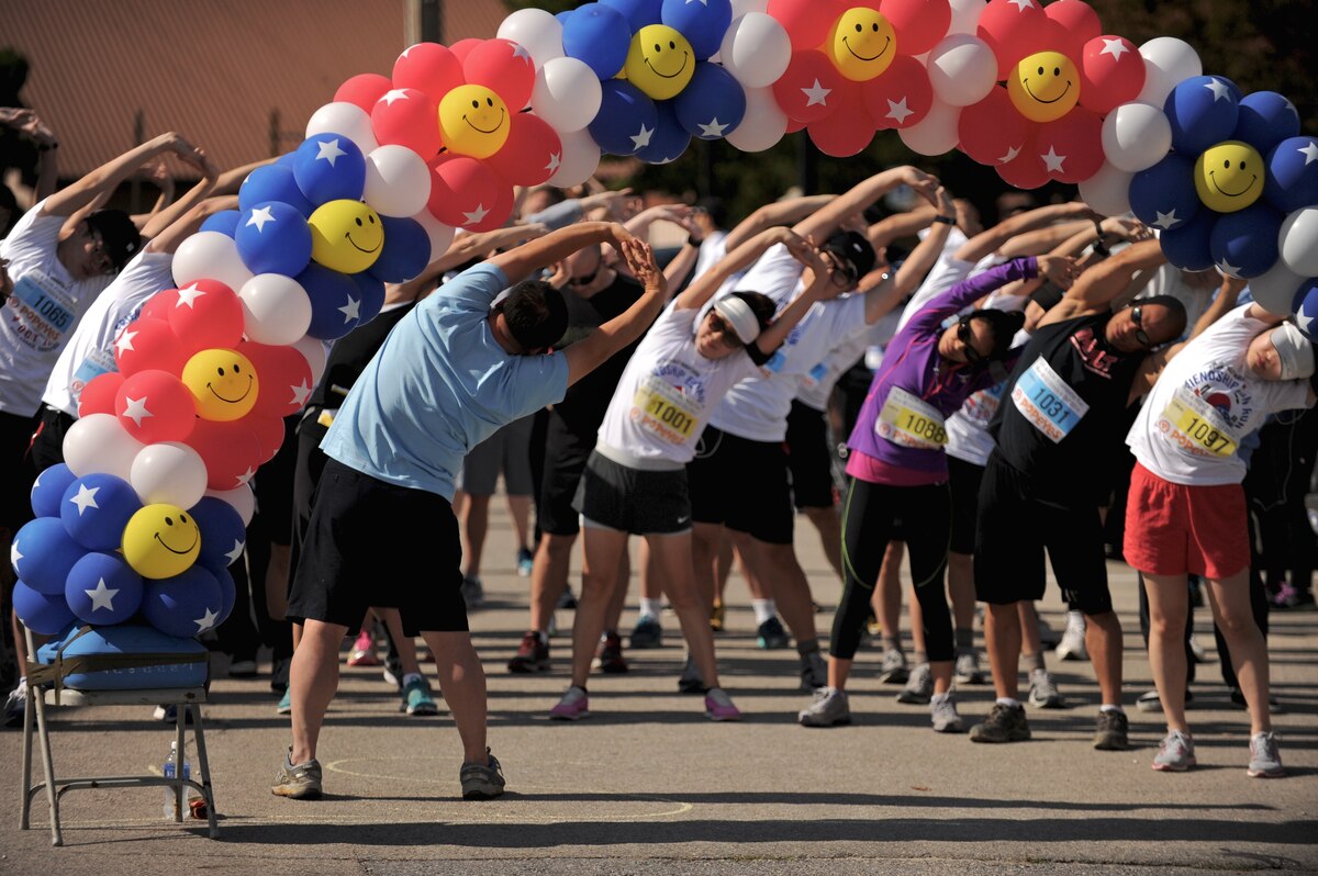 Moon, Hui Seong, one of over 50 volunteers, leads participants in stretches before a Friendship Fun Run Oct. 4, 2014 at Osan Air Base, Republic of Korea. The run was hosted by the 607th Air Operations Center and its Good Neighbors. More than 300 U.S. and Korean participants registered for the run. (U.S. Air Force photo by Maj. John Ross)